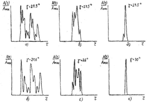 Рис. 1.13. Дальностные портреты: а, б, – самолета крупных размеров; в, г – самолета средних размеров; д, е – крылатой ракеты при различных ракурсах облучения На рис. 1.13 приведены ДП воздушных целей большого, среднего и малого размеров при полосе частот П = 80 МГц для длины волны λ = 10 см при различающихся ракурсах. Показано, что изменение ракурса цели большого размера на 0, 1°, цели среднего размера на 0.5° и цели малого размера на 2, 5° заметно меняет вид портрета. Однако наблюдается и известная повторяемость портретов через некоторые интервалы курсовых углов. Это позволяет сокращать число эталонных портретов, закладываемых в память ЭВМ для различных заранее выбранных секторов ракурсов. Номер сектора можно оценить до распознавания по результатам траекторного анализа. Еслитакихпортретов, например, в классе " большая цель", всего четыре, можно сказать, что этот класс разбивается на четыре подкласса (кластера).
