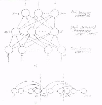 Поступающие значения ys (s=1, 2, …, m) подаются при этом в различных линейных комбинациях на т элементов " скрытого" слоя нейронов или, иначе, слоя " внутреннего представления", в котором эти комбинации претерпевают " мягкое² ограничение дифференцируемыми монотонно нарастающими функциями Выходные данные слоя внутреннего представления подаются, в свою очередь, на п - элементов выходного слоя нейронов, причем также в различных линейных комбинациях и с последующим " мягким" (или " жестким") ограничением. Описанную трехслойную нейроструктуру (рис. 2.1, а) называют персептроном Розенблатта (perception – восприятие, понимание, сознание). Трехслойная структура не является единственно возможной. Возможны, например, персептроны с четырьмя и более слоями. Анализ многослойных, трехслойных в частности, структур может сводиться, однако, к анализу однослойных структур с последовательно следующими т входными элементами N - т " скрытыми" элементами - элементами внутреннего представления п - выходными элементам (рис. 2.1.6). Входная информация в такой структуре перемещается строго вперед обеспечивая классифицированные решения на п - выходных элементах.