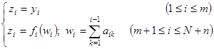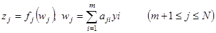 Пороги могут вводиться неодинаковыми β =β i при выборе функций fi(w)=f(w+β i). В случае трехслойного персептрона (рис. 2.1, а) часть введенных значений aik обращается в нуль. Отсчеты zi, а именно, входные, выходные и " скрытые", принимают вид