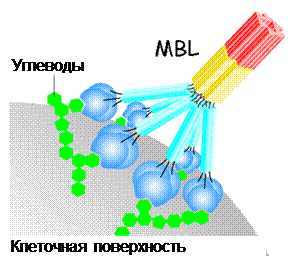 * α -2-макроглобулин (МГ) синтезируется главным образом в печени и является важнейшим фактором защиты соединительной ткани от деструктивного воздействия эндогенных протеиназ. Способность образовывать комплексы со всеми известными в настоящее время протеиназами позволяет говорить о нем как о «панингибиторе». Элиминируется МГ через существующие на клетках универсальные рецепторы эндоцитоза — LRP-рецепторы. Белок транспортирует биологически активные соединения и регулирует их связывание со специфическими рецепторами клеток, что сообщает ему свойства универсального иммунорегулятора. Наиболее изученным протеиномэтого класса является маннозосвязывающий лектин (mannose-binding lectin, MBL) - белок острой фазы, синтезируемыйпеченью под воздействием цитокинов воспаления (рис.1). Структурно и функционально маннозосвязывающий лектин подобен С1q компоненту комплемента. MBL – является олигомером или тримером, каждая субъединица содержит коллаген-подобный домен и углевод-распознающий домен С-лектинового типа. Маннозосвязывающий лектин распознает углеводы (содержащие остатки маннозы, фруктозы иN-ацетилглюкоз-аминогликаны) на поверхности микробов (в том числе грамотрицательных бактерий, микобактерий), грибов, дрожжей, некоторых паразитов и вирусов. С MBL ассоциированы сериновые протеазы (MASP 1 и 2), которые родственны C1r и C1s классического пути активации комплемента. При их активации происходит расщепление компонента комплемента С3, что запускает каскад активации комплемента по лектиновому пути. Помимо роли в активации системы комплемента, MBL действует как опсонин. Также MBL распознает собственные поврежденные клетки и участвует в их удалении. Сурфактантные протеины легких А (SP-A) и Д (SP-D) являются олигомерными углевод-связывающими протеинами, регулирующими опсонизацию, фагоцитоз и агглютинацию микроорганизмов в пределах респираторного тракта (рис.2). Локализация этих протеинов в респираторном тракте позволяет им действовать как факторам “первой линии защиты” против ингаляционных патогенов. SP-A действует как опсонин, увеличивая эффективность фагоцитоза макрофагами. Активность SP-D ограничена связыванием патогенов. Сурфактантные белки способны распознавать и связывать терминальные олигосахариды многих микроорганизмов (M. tuberculosis). Рисунок 2. Сурфактантные протеины легких.