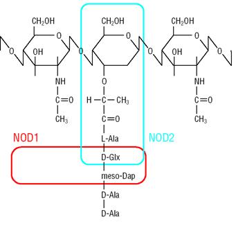 Рисунок 7. Структуры, распознаваемые белками Nod1 и Nod2. Nod1, универсально экспрессированный на клетках человека, распознает преимущественно ПГ грамотрицательных бектерий, в то время как Nod2 (экспрессирован на фагоцитах) – ПГ грамотрицательных (E. coli, Shigella flexneri) и грамположительных (B. subtilis, S. aureus) микроорганизмов.