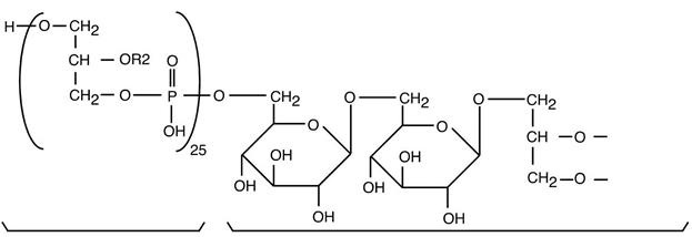 2. Тейхоевые кислоты (ТК). ТК – это водорастворимый полимер из 40 остатков рибитолфосфата (рис.8), связанный с ПГ клеточной стенки через соединительный фрагмент. Липотейхоевые кислоты (ЛТК). ЛТК – главный амбифильный компонент клеточной стенки грамположительных бактерий – состоит у стафилококков из 25 остатков полиглицеролфосфата, пронизывает ПГ и соединяется с ЦПМ. ЛТК по свойствам напоминает ЛПС грамотрицательных бактерий и образует мембраноподобные структуры. ТК и ЛТК часто подвергаются аланилированию и другим модификациям.