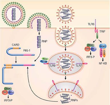 ТПР, способные обнаруживать вирусные НК, можно условно разделить на две группы: внеклеточные (ТПР3) и внутриклеточные (ТПР7, 8, 9). Двуцепочечная РНК распознается ТПР3, а также недавно открытыми RIG-I и MDA-5. Одноцепочечная РНК вирусов – ТПР7 и 8. Сигнальные процессы, развивающиеся в клетке после появления в ней вирусной РНК, приводят к появлению нескольких групп транскрипционных факторов: провоспалительные (NFkB, AP-1) и интерферон-регуляторные (IRF). Все они необходимы для начала синтеза интерферона клеткой. В начале инфекции синтезируется преимущественно ИФН-бета, провоспалительные цитокины, Т-клеточные и моноцитарные хемокины, что связано с наличием в клетке только IRF3 (см. рисунок). После синтеза ИФН и его рецепции в клетках появляется полный набор IRF (3, 7), что приводит к значительному синтезу ИФН-альфа (активация различных генов ИФН-альфа), активации генов противовирусных систем и рецепторов клетки, к которым относятся упомянутые выше PKR, OAS/RNAseL, ADAR (аденозиндезаминаза, вносящая множественные мутации в НК вируса), GTPase Mx и INOS (угнетение ферментов, необходимых для репликации вирусов), повышению экспрессии антигенов гистосовместимости (необходимо для нормальной реализации реакций клеточного иммунитета).