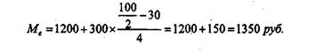 В нашем примере номер медианы равен 5, медиана равна 700 руб. (т.е. одна половина рабочих получила зарплату менее 700 руб., а другая – более 700 руб. в месяц). В случае четного объема ряда медиана равна средней из двух вариантов, находящихся в середине ряда. В интервальных рядах распределения медианное значение (поскольку оно делит всю совокупность на две равные по численности части) оказывается в каком-то из интервалов признака х. Этот интервал характерен тем, что его кумулятивная частота (накопленная сумма частот) равна или превышает полусумму всех частот ряда. Значение медианы вычисляется линейной интерполяцией по формуле: