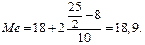 где – нижняя граница медианного интервала; - медианный интервал; – половина от общего числа наблюдений; – сумма наблюдений, накопленная до начала медианного интервала; – число наблюдений в медианном интервале. Формула (13) получена исходя из допущения о равномерности нарастания накоплений частоты внутри интервала и пригодна для любого интервального ряда. Рассчитаем медиану по данным табл. 4.4. Прежде всего найдем медианный интервал. Таким интервалом очевидно будет интервал стоимости ОПФ малых предприятий (18–20 тыс. руб.), поскольку его кумулятивная частота равна 18 (2+6+10), что превышает половину суммы всех частот (25: 2 = 12, 5). Нижняя граница интервала 18 млн руб., его частота 10; частота, накопленная до него, равна 8. Подставив данные в формулу (4.13), получим, тыс. руб.: