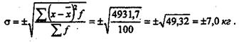 Что характеризует полученное квадратическое отклонение? Масса отдельных кип шерсти отклоняется от средней (96 кг) в одних случаях на большую величину, в других— на меньшую. В среднем это отклонение от средней составляет ±7, 7 кг. Из этих данных видно и другое: простое среднее квадратическое отклонение выражается в тех же именованных числах, что и средняя величина. Поэтому оно составляет так называемое абсолютное отклонение от средней величины. По данным примера рассчитаем также среднее квадратическое отклонение (взвешенное) для характеристики ряда распределения с неравными частотами. Для этого примем во внимание количество отгруженных кип, которые будут составлять частоты(f). Расчет производим по формуле: Построим расчетную таблицу (табл..14). Сначала определяем среднюю арифметическую взвешенную: Рассчитаем среднее квадратическое отклонение (взвешенное):