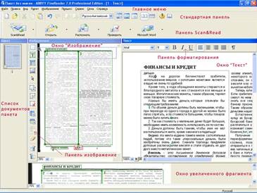 При сканировании текстовых документов получается графическое изображение - графический образ документа. Но графический образ еще не является текстовым документом. Человеку достаточно взглянуть на лист бумаги с текстом, чтобы понять, что на нем написано. С точки зрения компьютера, документ после сканирования превращается в набор разноцветных точек, а вовсе не в текстовый документ. Преобразованием графического изображения в текст занимаются специальные программы распознавания текста (Optical Character Recognition – OCR). Одна из самых известных программ для распознавания текстов – это FineReader. Программа FineReader выпускается отечественной компанией ABBYY Software (www.bitsoft.ru). Эта программа предназначена для распознавания текстов на русском, английском, немецком, украинском, французском и многих других языках, а также для распознавания смешанных текстов. Основные возможности OCR FineReader Ø улучшенная точность распознавания и сохранения, форматирования исходных документов; Ø распознавание и сохранение документов в удобном для пользователя формате, в том числе в формате PDF; Ø экспорт распознанного текста в офисные приложения; Ø возможность воспроизводить такие сложные элементы верстки, как непрямоугольные картинки, обтекание картинок текстом, различные шрифты, таблицы. Пакетная обработка – облегчает работу с многостраничными документами. Такие функции, как " распознать", " повернуть изображение", " очистка изображения", " сохранить" можно применять ко всему пакету в целом.Пиктограммы позволяют контролировать процесс пакетной обработки документов.Система проверки орфографии позволяет легко проверить и отредактировать распознанный текст. Неуверенно распознанные символы и слова, которых нет в словаре, выделяются различными цветами.Распознавание многоязычных документов – FineReader распознает тексты на 177 языках, включая английский, русский, немецкий, французский и др. Чтобы распознать документ, состоящий из русских и английских слов и фраз, следует перед распознаванием выбрать соответствующий язык распознавания, т.е. " Русско-Английский". Распознает любой тип шрифта, кроме рукописного и декоративного, данные типы шрифта процессор воспринимает как рисунок. Поддержка Windows XP – FineReader полностью совместим с операционными системами компании Microsoft. Прямой экспорт в Microsoft Word, Excel и Outlook – FineReader легко и быстро экспортирует результаты распознавания в офисные приложения. Обработка изображений различных форматов – FineReader поддерживает большое количество входных форматов файлов. Можно распознавать изображения, полученные из самых разных источников, в том числе факсы.