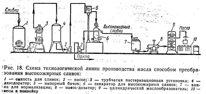 Тебования к качеству молока и сливок. Для производства масла используют молоко и сливки. Сливки получают на сепараторных пунктах, куда с ферм доставляют молоко, которое сепарируют, а сливки пастеризуют, охлаждают и доставляют на молочный завод. Получение сливок на сепараторных пунктах нежелательно. Наилучшим по качеству можно выработать масла из сливок, полученных непосредственно на молочном заводе. Поэтому предпочтительно доставлять молоко непосредственно с фермы на молочный завод. Требования к молоку, поступающему в переработку на масло, регламентируются действующим ГОСТ 13264-88 «Молоко коровье. Требования при закупках». Помимо стандартных требований, при производстве масла к молоку выдвигают особые требования: содержание жира в молоке, химический состав молочного жира. С повышением жирности молока увеличивается выход масла и улучшается использование жира, т. е. относительно меньшее количество жира остается в обезжиренном молоке и пахте. Для производства масла целесообразно направлять молоко повышенной жирности. На технологические режимы производства масла влияет химический состав молочного жира. От содержания в молочном жире различных жирных кислот зависит температура плавления и отвердевания масла. Зимой в молочном жире увеличивается количество насыщенных жирных кислот, вследствие чего масла приобретает твердую консистенцию. Летом в жире значительно возрастает содержание ненасыщенных жирных кислот и жидких фракций жира, масло имеет более мягкую консистенцию. Сливки для производства масла делят на два сорта. Сливки: первого сорта должны иметь чистый, свежий, слегка сладковатый вкус, без посторонних привкусов и запахов, однородную консистенцию. В сливках первого сорта не допускаются механические загрязнения, наличие комочков жира и хлопьев белка. Бактериальная обсемененность сливок первого сорта по пробе на редуктазу должна соответствовать требованиям I класса. Ко второму сорту относят сливки, у которых обнаружены слабовыраженные кормовой вкус и запах, в небольшом количестве комочки жира, отдельные хлопья белка. Бактериальная обсемененность сливок второго сорта по пробе на редуктазу не должна быть ниже II класса. Температура сливок первого и второго сортов во время приемки должна быть не выше 10°С. Кислотность сливок с массовой долей жира 27-55% для первого и. второго сортов составляет 18-10°Т. При приемке определяется термоустойчивость сливок пробой на кипячение и хлоркальциевой. Для сливок первого сорта характерно отсутствие хлопьев белка, второго сорта - допускаются отдельные хлопья белка. Сливки, не удовлетворяющие требованиям второго сорта, относят к несортовым. Для выработки всех видов масла кроме вологодского можно применять сливки, полученные в результате сепарирования подсырной сыворотки (подсырные сливки). Подсырные сливки должны иметь сладковато-солоноватый вкус, допускается сла6овыраженный кислый вкус, кислотность не более 30.°Т. Для этого подсырные сливки немедленно после получения охлаждают до 6-8°С. Продолжительность сбора однородной партии сливок при этой температуре не должна превышать 2 сут. Подготовка сырья к переработке на масло. Принятое на предприятие молоко сепарируют при температуре 35-40°С для получения сливок с желаемой массовой долей жира. Для выработки масла способом с6ива