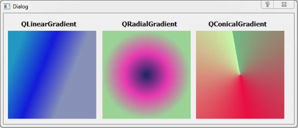 Цвета в градиенте определяется с помощью стоп-точки типа QGradientStop, т.е. положение и цвет. Используйте QGradient:: setColorAt() или QGradient:: setStops() для определения фиксированных точек. В дополнение к функциям, унаследованных от QGradient, класс QConicalGradient обеспечивает угол – angle () и центр - center (), эти функции, возвращающие угол начала и центр градиента.