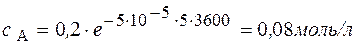 3. Задача. В реакции А ® В + С с общим порядком, равным единице, константа скорости k 1 = 5× 10-5 с-1. Определите концентрацию веществ А и В и скорость реакции через 1 час и через 5 часов, если начальная концентрация А составляла 0, 2 моль/л.