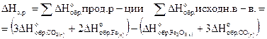 Пример 3. Сколько выделится теплоты при получении 1 кг железа по реакции Fe2O3(к)+3СО(г)=2Fe(к)+3СО2(г), если энтальпии образования Fe2O3(к), СО(г) и СО2(г) соответственно равны (кДж/моль): -822, 7; -110, 6 и -394, 0.