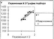 Рис. 6.25. Графики расположения фактических и предсказанных точек (пример б.16) Интерпретация результатов. В таблице Дисперсионный анализ оценивается достоверность полученной модели по уровню значимости критерия Фишера (строка Регрессия, столбец Значимость F, в примере — 1, 4Е—09 (1, 4*10-9), то есть р< < 0, 05 и модель значима) и степень описания моделью процесса — R-квадрат (вторая строка сверху в таблице Регрессионная статистика, в примере R-квадрат = 0, 89). Поскольку R-квадрат > 0, 8, можно говорить о довольно высокой точности аппроксимации (модель хорошо описывает зависимость заболеваемости от содержания углекислого газа и запыленности воздуха (рис. 6.25)). Далее необходимо определить значения коэффициентов модели. Они определяются из таблицы в столбце Коэффициенты — в строке Y-пересечение приводится свободный член а0 = 682; в строках соответствующих переменных приводятся значения коэффициентов при этих переменных а1 = 91 и а2 = 275. В столбце р-значение приводится достоверность отличия соответствующих коэффициентов от нуля. Вес коэффициенты значимы, то есть p < 0, 05, и коэффициенты могут считаться не равными нулю. Поэтому выражение для определения уровня заболеваемости органов дыхания в зависимости от содержания углекислого газа и пыли в воздухе будет иметь вид: Y=682 + 91*Х1 + 275*Х2.