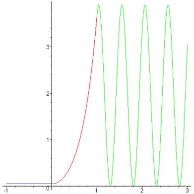 Как и следовало ожидать, решение внутри барьера выражается через экспоненты, а вне барьера – через тригонометрические функции. Естественно, в области слева от барьера после всех упрощений получилась константа. Напомним, что это не сама волновая функция, а квадрат ее модуля, т.е. плотность вероятности, а из (1.10) ясно, что квадрат модуля функции > plot({[x, f1, x=1..3], [x, f2, x=0..1], [x, f3, x=-1..0]});