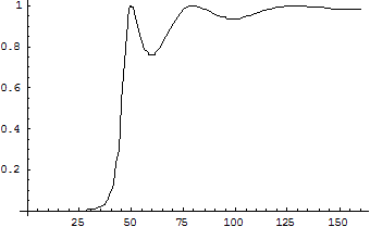 Рис. 3.4.Изменение коэффициента прохождения в зависимости от энергии для потенциального барьера, показанного на рисунке 1.4, полученное в Mathematica