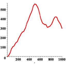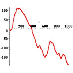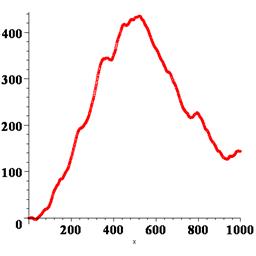 Теперь можно применить plot: > plot(X_, x=1..T, style=point, symbol=circle); Впрочем, можно построить точечный график, используя специально предназначенный для этого оператор pointplot, входящий в состав графической библиотеки plots (которую необходимо загрузить оператором with). Формат, приемлемый для него, – тот же самый двойной список. > with(plots); > pointplot(X_); В результате получаем график координаты частицы в зависимости от времени, т.е. «историю» ее случайных блужданий при данном прогоне программы. Можно повторить программу, начиная или с restart или с randomize, тогда получим другие результаты. На рисунке 4.1 показано несколько получившихся графиков. Несмотря на то, что для броуновской частицы интерес представляет только ее координата, для исследования самой модели и анализа ее адекватности, построим также график массива скорости частицы V: > V_: =[[n, V[n]] $n=1..T]: > plot(V_, x=1..T, style=line); Типичный график показан на рисунке 4.2. Из графика видно, что скорость частицы является негладкой (не дифференцируемой) функцией. Этого и следовало ожидать, исходя из предположения, заложенного в модель, о мгновенном характере изменения скорости при ударе со стороны молекулы.