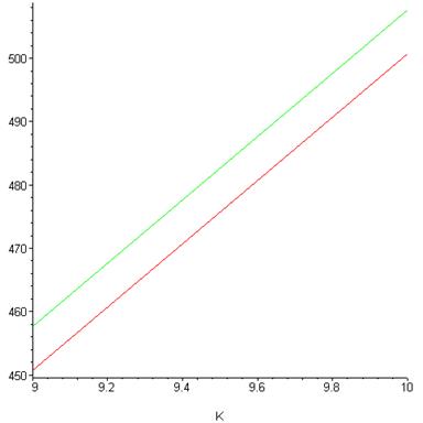 Видно, что расхождение существенное, причем кривые качественно различны при малых K, т.е. при высоких температурах (вспомним, что > plot({ln(Z_[5]), ln(f5)}, K=9..10);