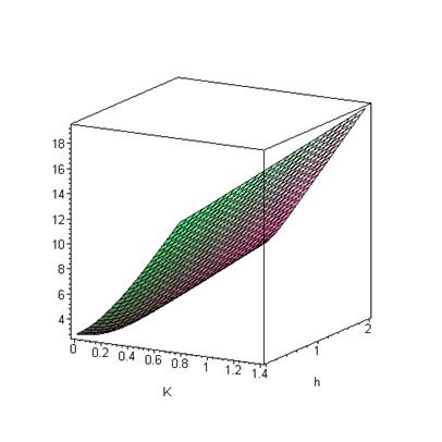 и построим график от двух переменных: > plot3d(ln(f2), K=0..1.4, h=0..2);
