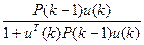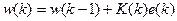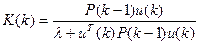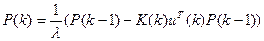 1. При поступлении новых входных данных u(k) производится фильтрация сигнала с использованием текущих коэффициентов фильтра w(k-1) и вычисление величины ошибки воспроизведения образцового сигнала: y(k)=u e(k) = d(k)-y(k). 2. Рассчитывается вектор-столбец коэффициентов усиления (следует отметить, что знаменатель дроби в следующих двух формулах является скаляром, а не матрицей): K(k) = 3. Производится обновление оценки обратной корреляционной матрицы сигнала: