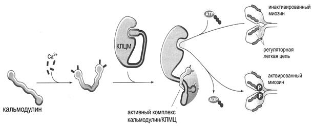 Рис. 12. Схема активации киназы легких цепей миозина (КЛЦМ) и фосфорилирования легких цепей миозина при помощи комплекса Са-кальмодулин.