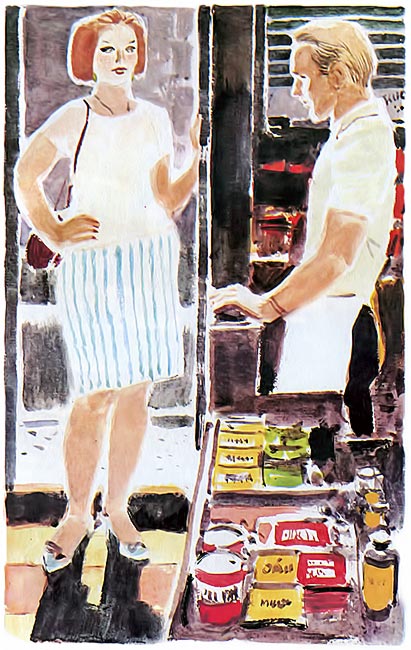 Итен сходил в кладовую и принес бумажный стакан с водой из-под крана. Бросив туда три плоские таблетки, Марджи дождалась, когда вода зашипит. — Будьте, — сказала она и выпила шипучку залпом. — Ну, черт, скорее действуй! — Я слышал, вы собираетесь сегодня предсказать Мэри ее судьбу. — О господи! Из головы вон! Всерьез, что ли, мне этим заняться? Тогда бы я и свою судьбу устроила. — Мери очень это нравится. А вы в самом деле умеете гадать? — Тут особого умения не нужно. Наслушаешься, что люди, то есть женщины, говорят о себе, а потом им же все это и выложишь, а они считают тебя пророчицей. — Ну а про высоких брюнетов? — И про брюнетов, конечно. Но если бы я умела читать в мужских сердцах, не было бы у меня в жизни таких промахов. Ox-ox-ox! И влопалась же я разочка два! — Ваш первый муж, кажется, умер? — Нет, второй, мир праху его, сукину… Ладно, замнем. Мир праху его. Итен участливо поздоровался с престарелой миссис Ежизински и, стараясь подольше растянуть отпуск четверти фунта масла, даже одобрительно отозвался о погоде, но Марджи Янг-Хант не торопилась уходить, а с улыбкой разглядывала банки паштета с золотыми наклейками и миниатюрные, как футляры для драгоценностей, баночки черной икры на прилавке около самой кассы. — Ну? — сказала Марджи, когда старуха, с трудом волочившая ноги, вышла из лавки, бормоча что-то себе под нос по-польски. — Что — ну? — Да так, вдруг в голову пришло… Если б я знала мужчин так же хорошо, как женщин, можно было бы гадать с вывеской. Поучили бы вы меня, Итен, что такое мужчины. — Вы и так достаточно их знаете. Может быть, даже больше чем достаточно. — Вот человек! Чувства юмора, что ли, у вас нет? — Прикажете сейчас начать обучение? — Нет, как-нибудь вечерком. — Хорошо, — сказал он. — Кружок. Мэри, вы и двое деток. Тема занятий: мужчины, их слабые стороны, их глупость и как всем этим пользоваться. Марджи не обратила внимания на его тон. — Разве так не бывает, что вам приходится просиживать за работой целые вечера? Отчеты к первому числу и прочее тому подобное? — Бывает. Работу беру на дом. Она подняла руки над головой и запустила все десять пальцев в волосы. — Почему? — спросила она. — Потому что потому оканчивается на «у». — А вы многому могли бы меня научить? Итен сказал: — «И когда насмеялись над Ним, сняли с Него багряницу и одели Его в одежды Его, и повели Его на распятие. Выходя, они встретили одного Киринеянина, по имени Симон, и заставили сего нести крест Его. И, пришедши на место, называемое Голгофа, что значит Лобное место…» — А ну вас! — Да-да, все так и было. — Вам известно, что вы настоящий сукин сын? — Известно, о дщерь иерусалимская! Она вдруг улыбнулась. — Знаете, что я сделаю? Такого сегодня нагадаю одному человеку, любо-дорого! Вы у меня будете самой что ни на есть важной персоной. Поняли? Чего ни коснетесь, все превратится в золото. Народный глашатай! — Она быстро подошла к двери и, оглянувшись с порога, оскалила зубы в улыбке. — Ну-ка, попробуйте оправдать свою репутацию и попробуйте не оправдать! До свидания, Спаситель! — Как странно звучит цоканье каблуков по тротуару, когда ими отстукивают в ярости. К десяти часам все изменилось. Распахнулись широкие стеклянные двери банка, и людская речка потекла туда за деньгами, а потом завернула к Марулло и вынесла оттуда разные деликатесы, без которых Пасха не Пасха. Итен чувствовал себя ка