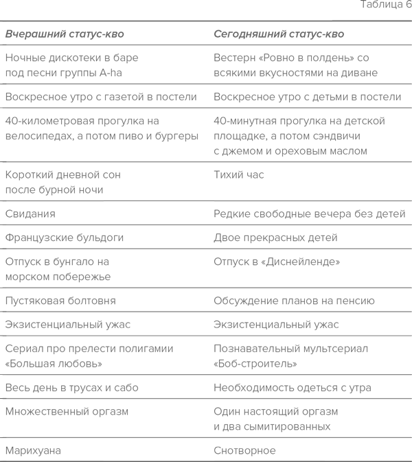 Согласитесь, в левой колонке представлены не утраты, а лишь другие виды деятельности, которые альтернативы из правой колонки в принципе не отменяют. Но теперь самое главное. Пока Роб и Эллен составляли свой список, они вспомнили лучшие моменты своего брака: например, как в первый раз кормили с детьми уток хлебом или как, расположившись на диване, лакомились тайской едой и смотрели старые фильмы. А также они вспомнили приятные моменты из своего прошлого, которые они могли бы воссоздать, если бы вели себя инициативнее. Они могли бы провести несколько дней на морском побережье, сплавив детей родителям Роба. Они могли бы оставить детей с няней и подымить косячками под записи группы Steely Dan в компании Нила и Синтии, которые все еще баловались такими вещами. Вот только безмятежное воскресное утро им не светило как минимум еще несколько лет. Но зато Эллен заставила себя записаться на благотворительную велосипедную гонку по побережью Калифорнии. А Роб вступил в лигу по боулингу. Да, из их жизни ушло много веселья и романтики, но в целом она все равно осталась замечательной — несмотря ни на какие потери.