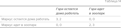 Маркус и Гэри — два ученых-пенсионера, которым не удавались совместные выходные. Даже на пенсии Маркус оставался трудоголиком, и ему было в радость просидеть всю субботу и все воскресенье в библиотеке, сочиняя грандиозный опус о средневековых священнослужителях. Гэри, специалист по романтической поэзии, тоже очень трепетно относился к своим Вордсворту и Блейку, но ему повезло больше — он знал, что в жизни есть еще что-то помимо науки. Поэтому он хотел заняться чем-нибудь на выходных: пойти поплавать, съездить куда-нибудь, да просто порадоваться жизни. Гэри как мог уламывал Маркуса работать поменьше и почаще гулять — но тот ни в какую не поддавался: «Такого упрямца еще поискать. Он так реагировал, как будто я приглашаю его посидеть в больничном кафетерии после процедуры колоноскопии». — Чем займемся в эти выходные? — на голубом глазу спрашивал Гэри где-нибудь в районе четверга. — Чем займемся? — переспрашивал Маркус. — Почему бы нам не сходить в кино? — Ну, может, в воскресенье, если я успею все доделать. А потом наступало воскресенье, и Маркус начинал стонать, что на улице слишком жарко или слишком холодно или что у него с прошлой прогулки до сих пор колено болит. И Гэри приходилось заставлять себя тоже над чем-нибудь поработать, или покопаться в саду, или поискать в Интернете дешевые авиабилеты в Европу. Маркус тем временем с головой уходил в свое исследование и попутно с нескрываемым раздражением переписывал статьи о средневековых мыслителях в «Википедии». Что тут не так? Да много чего, на самом деле. Но мы сконцентрируемся только на одном важном для нас моменте: Гэри хотел разнообразить свои выходные, но не делал этого. И не делал он этого потому, что Маркус не хотел. И чтобы провести выходные с Маркусом — что для Гэри было тоже важно, — он должен был сидеть дома. Гэри и Маркус играли в игру под названием «война полов». Участники этой игры хотят заняться разными вещами, но еще больше хотят остаться при этом вместе. И пусть вас не смущает то, что Гэри и Маркус оба мужчины, а «война полов» подразумевает, что воевать будут мужчина и женщина, — просто экономисты, как правило, создают гетеросексуально ориентированные теории. Предположим, что вы любите смотреть «Тачку на прокачку», а ваша вторая половина — «Проект Подиум». Но вы соглашаетесь посидеть перед телевизором и посмотреть ее (его) любимую передачу, потому что, хотя вы на дух не переносите Хайди Клум, вам совсем не хочется идти в другую комнату и наблюдать за преображением машин в гордом одиночестве. Вот вам игра в войну полов в действии. А вот как она выглядит с точки зрения специалиста по теории игр (таблица 14):
