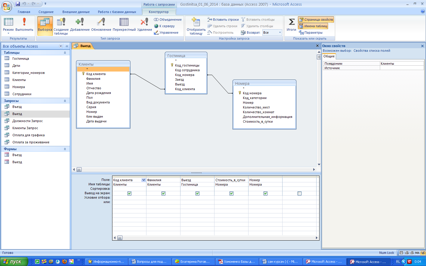 Для данного запроса использовали таблицы «Номера», «Клиенты», «Гостиница». Данный запрос отображает информацию о выезде клиентов.