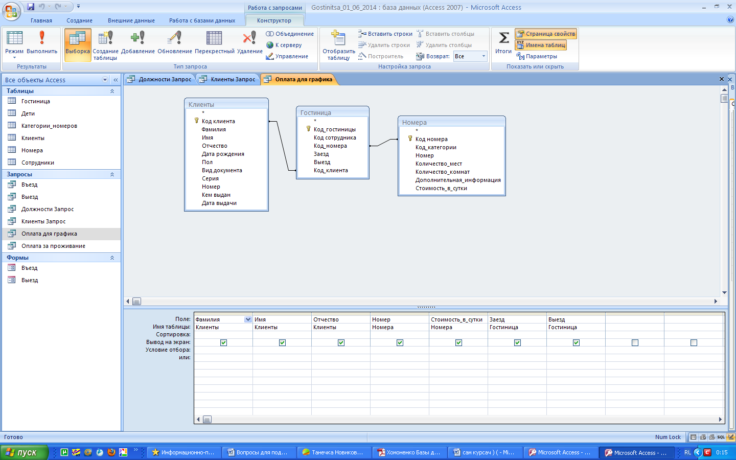 Для данного запроса использовали таблицы «Клиенты», «Номера», «Гостиница». Данный запрос отображает информацию о стоимости проживания клиента.