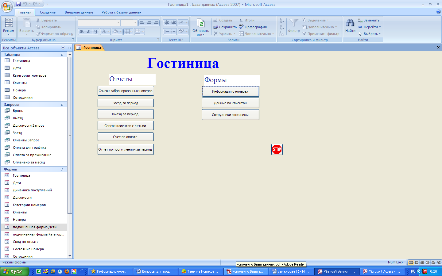 Главная кнопочная форма позволяет открывать все ранее созданные таблицы, формы и отчеты. Рис. 12. Главная форма При выборе кнопки «Информация о номерах» открывается следующая форма: