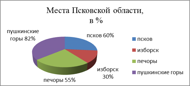 Целью развития туризма Псковской области является повышение конкурентоспособности существующего туристического продукта области на российском и зарубежных рынках. Задачи развития: 1) закрепление существующей специализации туристического сектора и постепенная ее диверсификация; 2) увеличение туристического потока; 3) развитие инфраструктуры туризма и гостеприимства; 4) развитие внешних инфраструктур и институциональной среды развития сектора. Среди направлений развития можно выделить[12]: 1). Развитие туристического продукта области. Формирование локальных туристических маршрутов, рассчитанных на 2-3-дневное пребывание туристов, проведение фестивалей и укрепление событийного туризма (проведение музыкальных, театральных и прочих мероприятий, с использованием объектов историко-культурного наследия). Создание семейных туристических программ пребывания в области; развитие сельского туризма за счет поддержки муниципальных инициатив и проектов по развитию локальной инфраструктуры; развитие водного туризма: формирование необходимой инфраструктуры для развития речного туризма. На основе проведенного опроса для развития туристического продукта области, можно предложить такую трехдневную программу для туристов: Первый день: 8.00 Приезд в Псков. Устройство в гостиницу. 9.00 Обзорная пешеходная экскурсия по городу (Псковский Кремль: Довмонтов город, Троицкий собор, Приказная палата, памятник Святой Равноапостольной княгине Ольге). 12.00 Экскурсия в историко-художественный архитектурный музей «Поганкины палаты». 14.00 Экскурсия к собору Рождества Иоанна Предтечи. 16.00 Экскурсия в Мирожский монастырь. 17.30 - 18.30 перерыв. 18.30 Отправление за город к памятнику Александра Невского. Свободное время. Второй день: 8.00 Отъезд из гостиницы на экскурсию в Печоры и Изборск. 9.00 Экскурсия к Изборской крепости на Журавлевой горе. 10.30 Посещение креста у стен Изборской крепости. 11.00 Экскурсия в Никольский собор. 12.00 Экскурсия к Словенским ключам. 13.30 Экскурсия в Свято-Успенский Псково-Печерский мужской монастырь, знакомство со святынями и достопримечательностями. 15.00 Экскурсия вдоль Печорской крепости. 16.00 Экскурсия к Куниченой горе. Свободное время Третий день: 8.00 Отъезд из гостиницы на экскурсию в Пушкинские горы 11.30 Экскурсия в Музей заповедник А.С.Пушкина, усадьба Михайловское. 13.00 Экскурсия в Музей заповедник А.С.Пушкина, усадьба Тригорское. 14.00-15.00 перерыв. 15.00 Экскурсия в Музей заповедник А.С.Пушкина, усадьба Петровское. 17.00 Экскурсия в Святогорский монастырь и посещение могилы А.С. Пушкина. Отправление домой. Представленная программа может быть интересна людям разных категорий, как учащимся школ, так и студентам, как туристам из России, так и иностранным туристам. С помощью данной программы можно больше узнать об истории Псковской области и посетить одни из самых интересных мест региона. Также к данной программе можно добавить еще такие праздники как: масленица, день города, фестиваль Хельги, всероссийский Пушкинский праздник поэзии и т.д. Данная программа составлена на основе ответов опрошенных людей (60 человек). Большинство опрошенных, на вопрос: «Какие места Псковской области вы хотели бы посетить?» - ответило Псков(60%), Изборск(30%), Печоры(55%) и Пушкинские горы(82%). Эти данные можно изобразить в виде диаграммы (рис. 5).