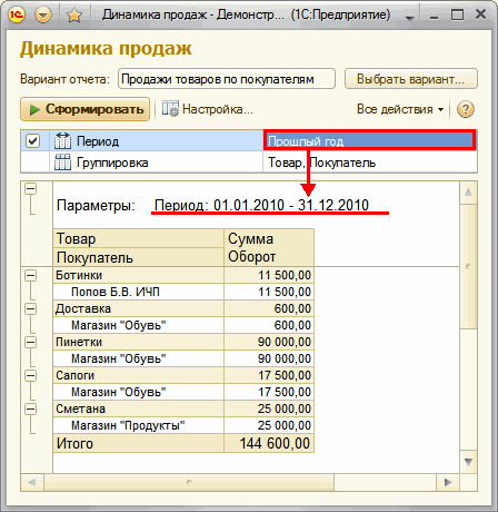 Допустим, необходимо получить отчет о продажах за предыдущий год. Для этого нам следует изменить параметр Период и нажать кнопкуСформировать: