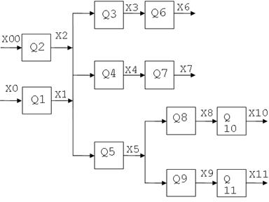 Логическая модель получается на основе структурной. При этом необходимо соблюдать следующие формальные правила: а) блоки Рi заменяются на Qi; б) если блок Рi имеет несколько выходов, то он заменяется таким же количеством блоков, каждый из которых имеет один выход и существенные для него входы; в) выходы и входы блоков представляются как Хi.