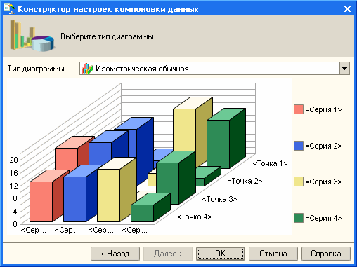 Рис. 194. Выбор диаграммы в конструкторе настроек отчета По окончании работы с конструктором настроек компоновки данных сохраненные настройки станут доступными для последующих изменений в окне настроек отчета.