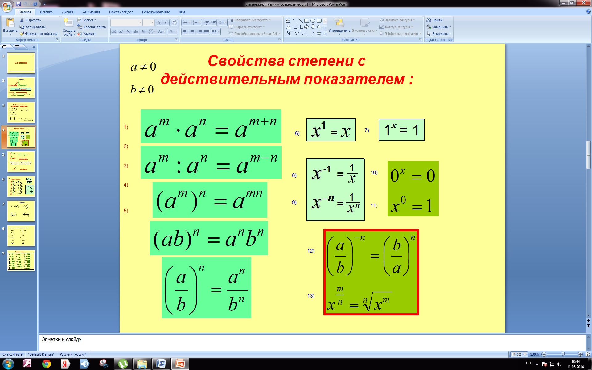 1) Что такое степень? 2) Перечислите свойства степеней. 3) Как записать дробный показатель степени в виде радикала?