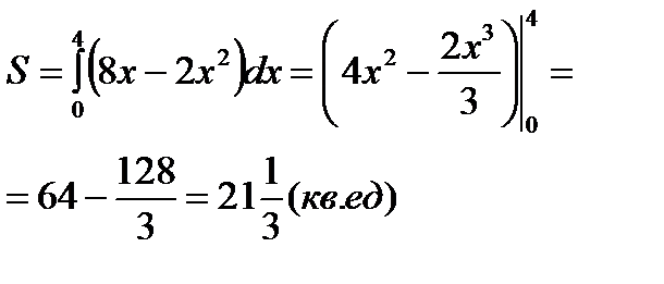 1) Выполняем чертеж; 2) Найдем пределы интегрирования: x2–2x+2=2+6x–x2, откуда х=0 – нижний предел интегрирования и х=4 – верхний предел интегрирования; 3) Составим подынтегральную функцию: f(x)=2+6x–x2 – (x2–2x+2)=8x–2x2;