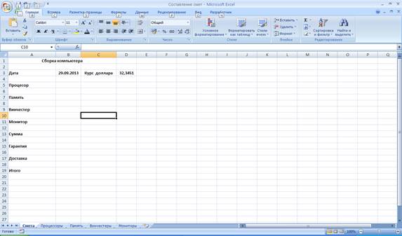 Порядок выполнения работы: I. Подготовка основного текста сметы. 1. Переименуйте рабочие листы в следующем порядке: Смета, Процессоры, Память, Винчестеры, Мониторы. ( Если количество созданных по умолчанию листов недостаточно, то добавьте предварительно новые листы ) 2. На листе «Смета» в ячейку А1 введите текст Сборка компьютера. В ячейки А3, А5, А7, А9, А11, А13, А15, А17, А19 и С3 введите соответственно: Дата, Процессор, Память, Винчестер, Монитор, Сумма, Гарантия, Доставка, Итого, Курс доллара. 3. Введите в ячейку В3 функцию =СЕГОДНЯ(). В ячейку D3 введите текущий курс доллара.