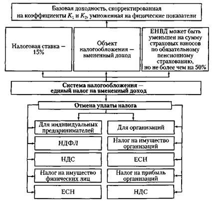 Налоговым периодом по единому налогу признается квартал. ЕНВД может быть уменьшен на сумму уплаченных взносов по обязательному пенсионному страхованию, сумму выплаченных пособий по временной нетрудоспособности, но не более чем на 50% (п. 2 ст. 34632 НК РФ). Пример 8.11. ООО «Мастер» оказывает услуги по ремонту бытовой техники. С 1 января 2008 г. ООО «Мастер» является плательщиком ЕНВД. В течение 2008 г. в ООО «Мастер» работали 18 человек. Сумма страховых взносов на обязательное пенсионное страхование работников за 2008 г. — 25 000 руб. Сумма ЕНВД за этот же период — 40 000 руб. Значит, размер единого налога, исчисленный ООО «Мастер» за 2008 г. можно было уменьшить не на всю сумму пенсионных взносов, а лишь частично — на 20 000 руб. (40 000 руб. х 50%: 100%). Структурно-логическая модель ЕНВД приведена на схеме.