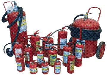 Рис. 8.4.2. Порошковые огнетушители унифицированные Принцип действия огнетушителя основан на использовании энергии сжатого газа для аэрорирования и выброса огнетушащего порошка. Огнетуитель состоит из корпуса 1, наполненного огнетушащим порошком. На горловине корпуса посредством накидной гайки закреплена головка 6 с бойком. На головку установлен: источник газа — ИХГ Для приведения огнетушителя в действие необходимо выдернуть опломбированную чеку и отвести вверх рукоятку запуска 5, при этом боек приводит в действие источник газа 3 или 9, в результате чего рабочий газ через газоотводную трубку 2, при использовании ИХГ, или отверстия в корпусе 9 газогенератора ГГУ аэрирует порошок и создает внутри корпуса огнетушителя требуемое избыточное давление. Дальнейшее управление работой огнетушителя осуществляется путем нажатия кистью руки на ручку 12 пистолета-распылителя 8, при этом огнетушащий порошок через гибкий рукав 7 и пистолет-распылитель подается на очаг пожара. Порядок работы и техническое обслуживание огнетушителей Тушение необходимо производить с наветренной стороны с расстояния не менее 3- 4 метра. После окончания тушения необходимо нажать на ручку 3 и выбросить остаток порошка. Заряженные огнетушители при хранении и транспортировании могут находиться как в вертикальном, так и в горизонтальном положении. Один раз в четыре года необходимо производить освидетельствование огнетушителя. Перезарядка, ремонт и освидетельствование огнетушителей должны производиться в специализированных организациях.
