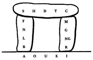 Ключ к этому алфавиту отыскался в упоминании Амергином дольмена. Это - алфавит, который лучше всего объясняяется, когда он построен в виде дольмена из согласных с порогом из гласных. Дольмены напрямую связаны с календарем в легенде о бегстве Граине и Диармойда от Финна Мак Коола. Бегство продолжалось один год и один день, и любовники каждую ночь останавливались возле нового дольмена. Бесчисленные " ложа Диармойда и Граине" есть в Корке, Керри, Лимерике, Типперэри и на западе, и каждое из них отмечено дольменом. Таким образом, этот алфавит-дольмен послужит и как календарь с одним столбом для весны, другим - для осени, перемычкой - для лета и порогом - для Новогоднего дня. Итак:
