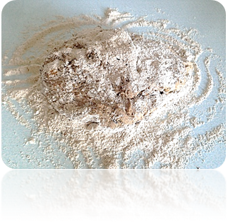 - Формируем из теста колобок. Насыпаем на рабочую поверхность немного отрубей, кладём колобок сверху, обстукиваем его по кругу, делая как можно выше и 'уже (около 15 см в диаметре).