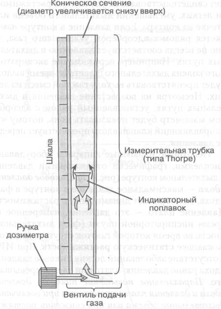 Поворот рукоятки вентиля подачи против часовой стрелки вызывает перемещение штифта по резьбе, что позволяет газу проходить через вентиль. Стопоры, установленные в крайних положениях, препятствуют повреждению вентиля. Дозиметры служат для регулирования и измерения потока газов, поступающих в аппарат по шлангам из системы снабжения ими. В аппаратах с постоянным потоком газов предусмотрены дозиметры, представляющие собой совокупность ротаметрических трубок, в каждой из которых поток газа дозируется изменением уровня поплавка. Точность дозировки в таких аппаратах зависит от максимального газотока, на который рассчитана данная ротаметрическая трубка. Чем больший газоток она может обеспечить, тем выше вероятная погрешность в дозировке. Чтобы избежать значительной неточности в этом отношении, на многих аппаратах для дозировки кислорода предусмотрены две трубки, одна из которых рассчитана на поток 10 л/мин, другая — 2 л/мин. В просвете измерительной трубки конического сечения (типа Thorpe) находится индикаторный поплавок, который поддерживается на весу потоком газа. В нижней части трубки, где диаметр трубки наименьший, даже поступление газа с небольшой скоростью создает давление под поплавком, достаточное, чтобы поднять его. По мере того как поплавок поднимается, диаметр трубки увеличивается, пропуская все больший поток газа вокруг поплавка. Подъем продолжается до тех пор, пока разница давления между верхушкой и основанием поплавка позволяет поддерживать его на весу. Если поток увеличивается, давление под поплавком возрастает, и он смещается выше в просвете трубки до нового состояния равновесия между разницей в давлении и весом. Разница давления зависит только от веса и поперечного сечения поплавка и не зависит от скорости потока газа или положения поплавка в трубке.Иными словами, чем выше находится поплавок, тем шире сечение трубки и тем больший поток газа требуется для поддержания постоянной разницы давления в потоке и самоцентруется, что снижает эффект его трения о стенки трубки. Внутренняя поверхность трубки покрыта токопроводящим веществом и заземлена, что уменьшает накопление статического электричества. Дозиметры ротаметрического типа, которыми снабжены большинство аппаратов, требуют внимательного наблюдения за их работой, периодической проверки соответствия показателей дозируемому газотоку. Во время эксплуатации аппаратов нужно обращать внимание на то, насколько при регуляции газотока поднимаются и опускаются поплавки дозиметров, нет ли деформации их, не загрязнены ли ротаметрические трубки. В случаях сомнения и правильности показаний ротаметра исправность его следует проверить с помощью газовых часов или другого тщательно выверенного ротаметра. Спирометры и датчики давления в дыхательном контуре (манометры). Дыхательный объем, ритмически подаваемый больному из дыхательного контура, измеряется спирометром. Спирометр Райта (Wright), расположенный в экспираторном колене дыхательного шланга, перед клапаном выдоха, измеряет выдыхаемый дыхательный объем. Поток газа внутри спирометра приводит во вращательное движение крыльчатки или роторы; степень ротации измеряется электронным, фотоэлектрическим или механическим способом. В современных наркозных аппаратах для измерения минутного объема дыхания 