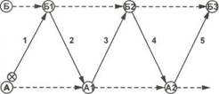 6. Трое игроков А, Б и В выполняют комбинацию «двойная стенка». Им противодействуют защитники Г и Д. Игрок А ведет мяч вперед. Ему противодействует защитник Г. Игрок А направляет мяч открывшемуся партнеру Б. Тот выполняет ему обратную передачу. Приняв мяч, игрок А ведет его вперед, играет на партнера В, получает обратный пас в одно касание и наносит удар по цели (рис. 220). Периодически партнеры меняются ролями. 7. 8. Двое нападающих играют против двух защитников. Упражнение про 9. Занимающиеся упражняются в выполнении комбинации «пропуска