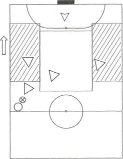 Рассмотрим несколько вариантов комбинированной обороны. На рис. 242 двое обороняющихся плотно опекают двоих соперников, а двое из партнеров играют каждый в своей зоне, обеспечивая подстраховку первых и контроль за перемещениями остальных игроков атакующей команды. На рис. 243 один из обороняющихся персонально опекает нападающего с мячом, а дальше от мяча игроки охраняют соответствующие зоны.