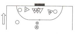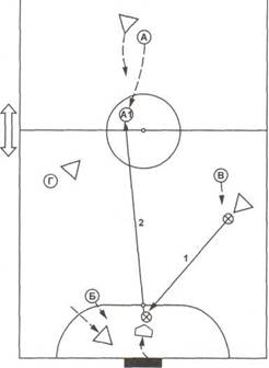 Рис. 250 9. Вратарь занимает позицию в воротах. Игрок А с мячами располагается на фланге. В штрафной площади обозначается круг диаметром 1, 5 м. Рядом с вратарем располагается игрок Б. Игрок А направляет мячи ударом ногой по навесной траектории в круг или на игрока Б. Последний стремится головой направить мяч в ворота. Вратарь ловит мячи, летящие в круг, и отбивает мячи, летящие на игрока Б (рис. 250).