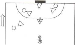 Руководство действиями партнеров в обороне. В мини-футбольных командах на сегодняшний день практически не осталось вратарей, которые бы в той или иной степени ни руководили действиями партнеров при обороне ворот. И это не случайно. Находясь во время атаки соперников позади всех партнеров, вратарь ясно видит наиболее уязвимые места защиты, имеет возможность предугадать действия атакующих. Оценив складывающуюся ситуацию, он дает четкие и понятные указания партнерам, акцентируя их внимание на направлении развития атаки соперников, на необходимости перестроений защитных линий, на подстраховке партнеров. Таким образом, вратарь осуществляет контроль за игрой соперников и действиями в защите игроков своей команды. Особенно велика роль вратаря при построении «стенок», когда соперники разыгрывают стандартные положения. Например, при угловом ударе вратарь, заняв позицию у ближней стойки ворот, контролирует действия всех партнеров, которые должны перекрыть путь мяча в штрафную площадь и своими действиями не дать возможности соперникам выполнить завершающий удар по воротам. В данном случае в стенку становится один из защитников, а остальные занимают позиции для решения упомянутой тактической задачи (рис. 255). Особо важное значение имеет правильное руководство установкой «стенок» при розыгрыше соперниками штрафных и свободных ударов. «Стенка» может состоять из одного, двух или трех защитников, иногда в «стен-