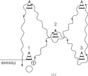 1. Жонглирование мячом ногами (поочередно правой и левой ногой), раз. 2. Жонглирование мячом головой, раз. Из трех попыток учитывается 3. Бег 30 м с ведением мяча, с. Упражнение выполняется с высокого старта. На дистанции испытуемый делает не менее трех касаний мяча. Ведение осуществляется любым способом. 4. Ведение мяча по «восьмерке», с. Стойками обозначается квадрат со сторонами 10 м. В середине квадрата устанавливается пятая стойка. По сигналу испытуемый выполняет рывок с мячом от стойки 1 к стойке 2, обходит ее и ведет мяч к стойке 3 и т.д., финишируя у стойки 1 (рис. 275). Из двух попыток засчитывается лучшая.