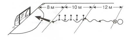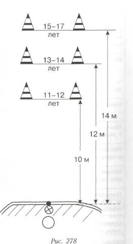 Рис. 276 5. Удар ногой по неподвижному мячу в цель, число попаданий. определенном расстоянии от 6-метровой отметки для отдельных возрастных групп) обозначаются два круга - А и Б (рис. 276). Их диаметр -2 м. В середине прямой, соединяющей центр каждого круга с 6-метровой отметкой, устанавливается стойка высотой 1 м. Испытуемый выполняет по 3 удара правой и левой ногой по неподвижному мячу в тот и другой круг. Мяч устанавливается на 6-метровой отметке. Таким образом, испытуемый выполняет 6 ударов. Попадание засчитывается, если мяч, пролетев над стойкой, опустился в круг или коснулся его линии. Учитывается общее число попаданий. 6. Комплексный тест (ведение мяча, обводка стоек и удар в ворота), с.