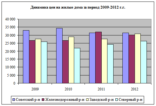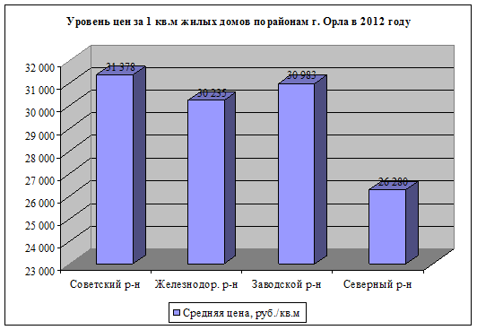За период с 2009 г. по конец 2012 г. на рынке жилых домов отмечались колебания цен как в большую, так и в меньшую сторону, что обусловлено общим ростом цен на жилье, а также корректировкой запрашиваемых цен на элитное жилье в меньшую сторону в связи с недостаточным платежеспособным спросом. Динамика цен на жилые дома в разрезе муниципальных районов г. Орла представлена на следующей гистограмме: