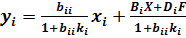 где kj – коэффициент передачи компенсирующей перекрёстной связи от j -го на i -й канал; kfk – коэффициент передачи компенсирующей обратной связи по k -му внешнему возмущению, действующему в i -м канале связи. Поскольку не было налажено никаких ограничений на номер k внешнего возмущения и на номер j соседнего канала управления (кроме j ≠ i), то соотношения (4.5) пригодны для организации компенсации любых возмущений, воздействующих согласно уравнению (4.3) на i -й канал управления. Также, поскольку не были наложены ограничения на номер i рассматриваемого канала управления, соотношения (4.3) и (4.4) пригодны для организации инвариантного управления любым каналом в рамках АСУТП, управляющей любым ТО, описываемым системой линейных уравнений (4.2). Трудностью при построении инвариантной системы управления является нелинейность как внутренних, так и внешних связей, приводящих к нежелательным отклонениям параметров ТО от заданных значений. Кроме того, проектирование каналов управления, инвариантных к внешним возмущающим воздействиям, осложняется трудностями выделения и измерения воздействий такого рода. В качестве примера можно привести трудности учёта влияния температуры окружающей среды в различных точках ТО, где она может быть различной и зависеть от различных факторов. Иногда причины, вызывающие отклонения параметров от заданных значений, обусловлены случайными факторами, влияние которых трудно учесть заранее. Практически невозможно добиться полной инвариантности управляемого техпроцесса по отношению ко всем внешним возмущениям. Поэтому обычно ограничиваются компенсацией основных возмущений, а для нейтрализации остальных возмущающих воздействий вводят отрицательную обратную связь по отклонению управляемого (регулируемого) параметра от заданного значения. На рис.4.1 отрицательная обратная связь по управляемому параметру yi реализована посредством звена с коэффициентом передачи ki. Будем считать, что возмущающие воздействия xj и fk скомпенсированы, как показано на рис.4.1, а остальные возмущения нейтрализуются отрицательной обратной связью. Внешние возмущения представлены на рис.4.1 в виде столбца F, действующего через строку Di матрицы D в соответствии с соотношением (4.3). Аналогично действует столбец X через строку Bi матрицы B. Действие отрицательной обратной связи по параметру yi соответствует добавлению члена –biikiyi в правую часть уравнения (4.3). После перенесения этого члена в левую часть уравнения (4.3) с учётом введённых обозначений Bi и D получим: