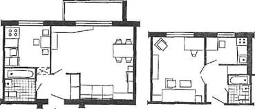 Рис. 1 - Примеры планировочных решений однокомнатных квартир Однокомнатная квартира включает комнату, кухню, прихожую, санитарно-технический узел. Комната служит местом для различных занятий, отдыха, сна. Кухню и совмещенный санузел располагают со входом из передней (прихожей) (рис. 1). Двухкомнатные квартиры предназначены для заселения семей из двух-трех человек. Они могут иметь планировку с изолированными или смежными комнатами. Санитарный узел, как правило, раздельный. Большую комнату используют как гостиную, меньшую - как спальню (рис. 2).